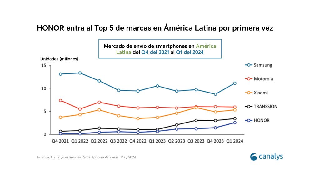 HONOR se posiciona rápidamente como una de las marcas más importantes en el mercado de smartphones; logrando ingresar por primera vez al Top 5 de las marcas más vendidas en América Latina durante el Q1 de 2024, de acuerdo con Canalys. En este periodo, la firma de análisis se mercado de la industria tecnológica también señaló que HONOR alcanzó una cuota de mercado del 7% y una tasa de crecimiento interanual del 293%.